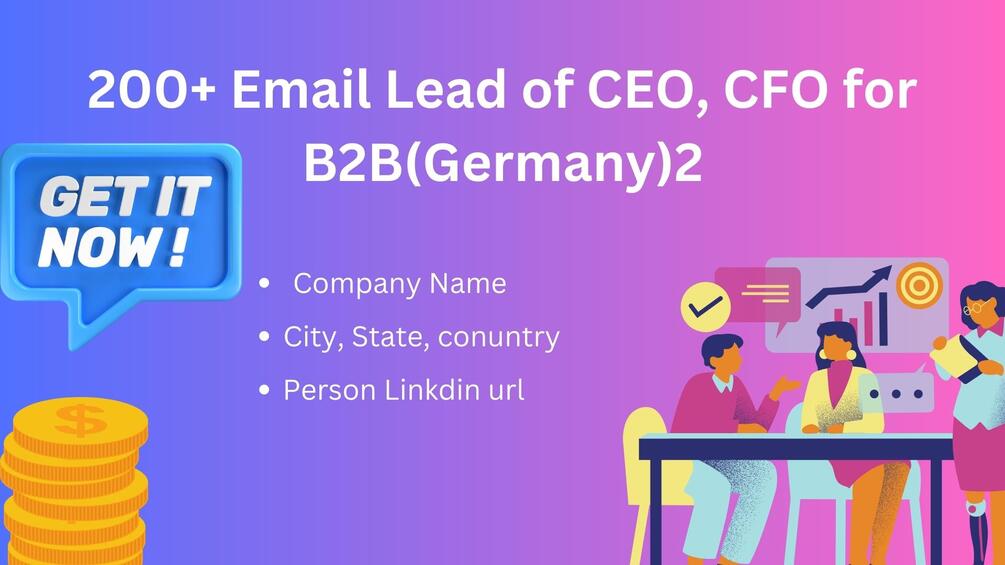 Do you want to grow your B2B business in Germany? Do you want to get in touch with the leaders of your target companies? If yes, then you need this free list of 200+ leads of CEO and CFO for B2B in Germany. This list contains the names, emails, phone numbers, and company names of the top executives in various industries. You can use this list to contact them via email, phone, or social media and present your products or services. This list is a useful resource for any B2B marketer who wants to expand their network and generate more sales in Germany. To get this free list, just visit [Gumroad] and download it now. Don’t miss this opportunity to get access to 200+ high-quality leads for free. Download your copy now and start growing your B2B business in Germany.